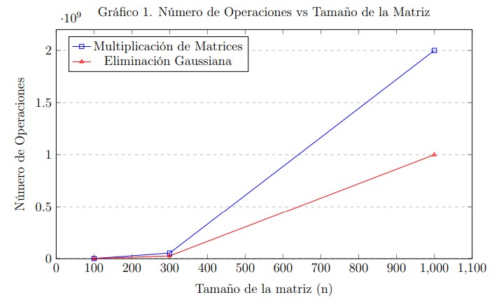 A continuación se muestra una tabla con los resultados obtenidos al comparar la multiplicación de matrices y la eliminación Gauss-Jordan sobre matrices de distintos tamaños. Se reporta el número total de operaciones y el tiempo de ejecución en segundos.