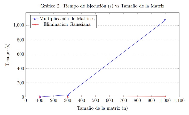 | Tamaño (n) | Operaciones Multiplicación | Tiempo Multiplicación (s) | Operaciones Gauss | Tiempo Gauss (s) |